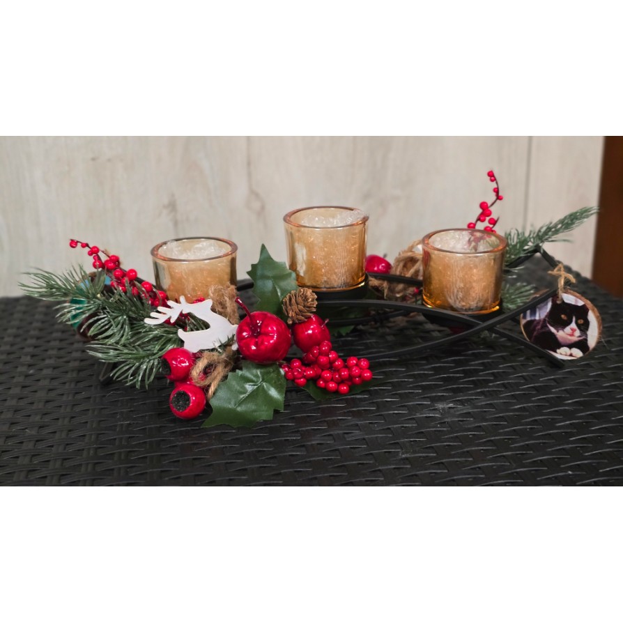 Centrotavola portacandele in ferro con decorazioni natalizie e foto piccini