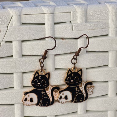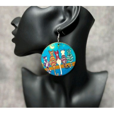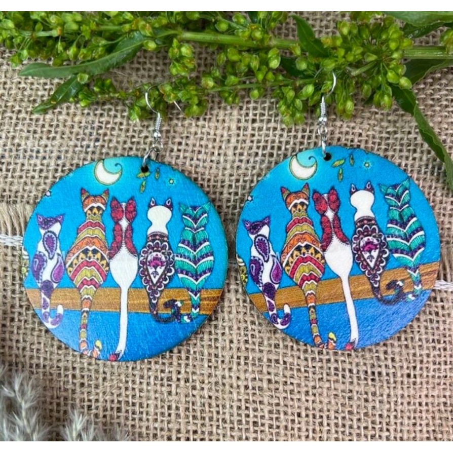Orecchini in legno con stampa disegno 5 gatti, misura 6 cm
